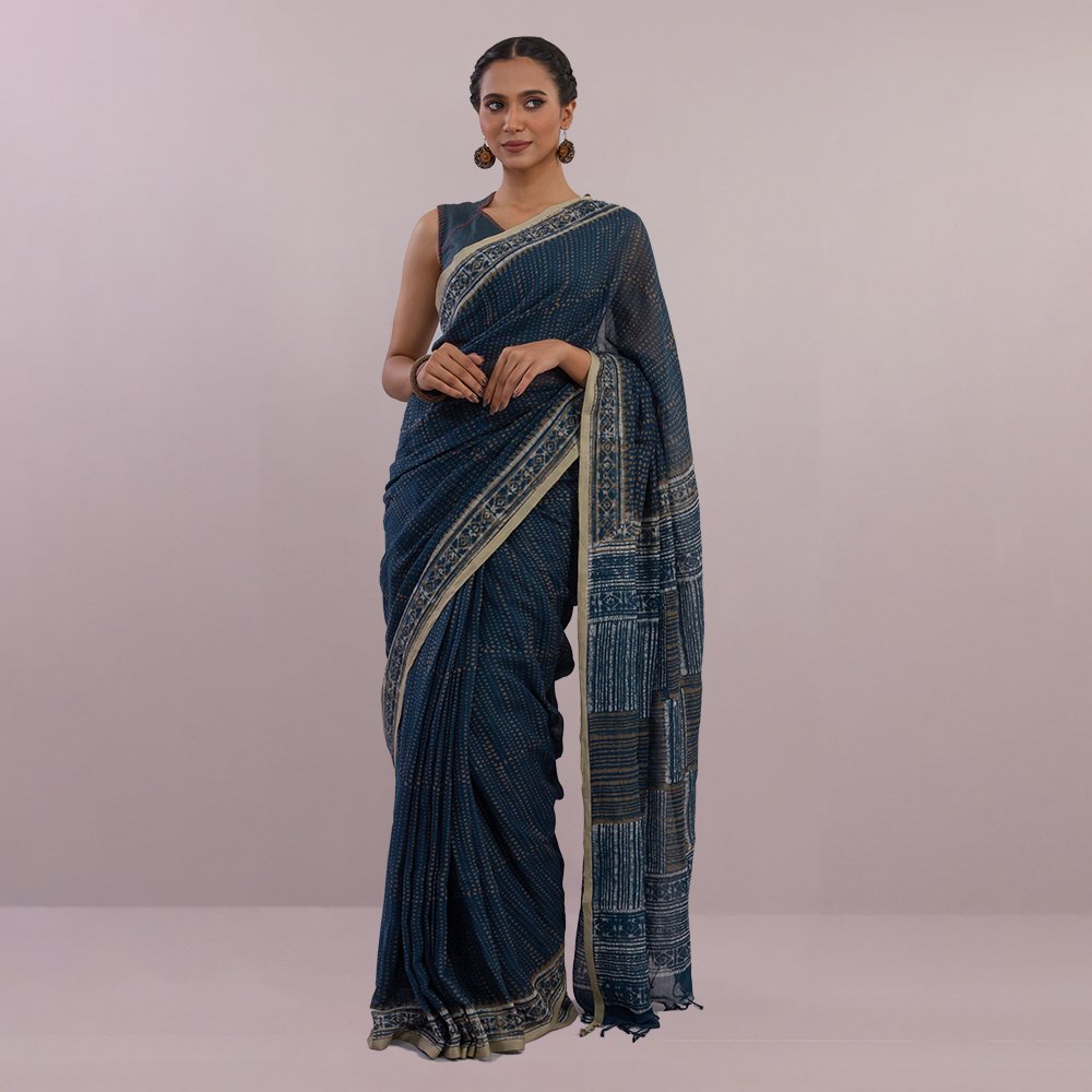 natural colour indigo have been used as dyeing materials on this cotton kota saree. Wax print was used to get the elegant design. All Aranya products are handmade, using natural fibers and materials, within a fair trade framework.