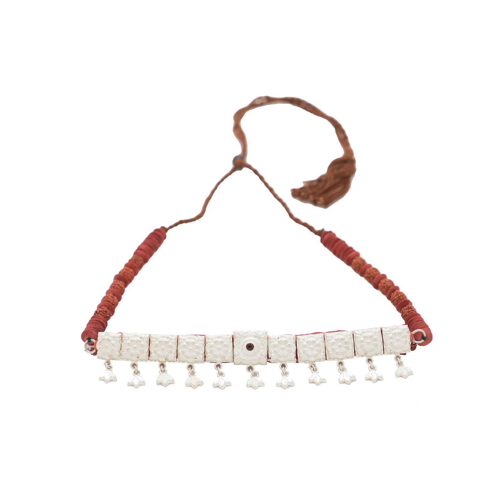 These handcrafted silver necklace have been intricately shaped and designed with parts of handcurved silver and beads which have finally been attached with straight shaped beads.