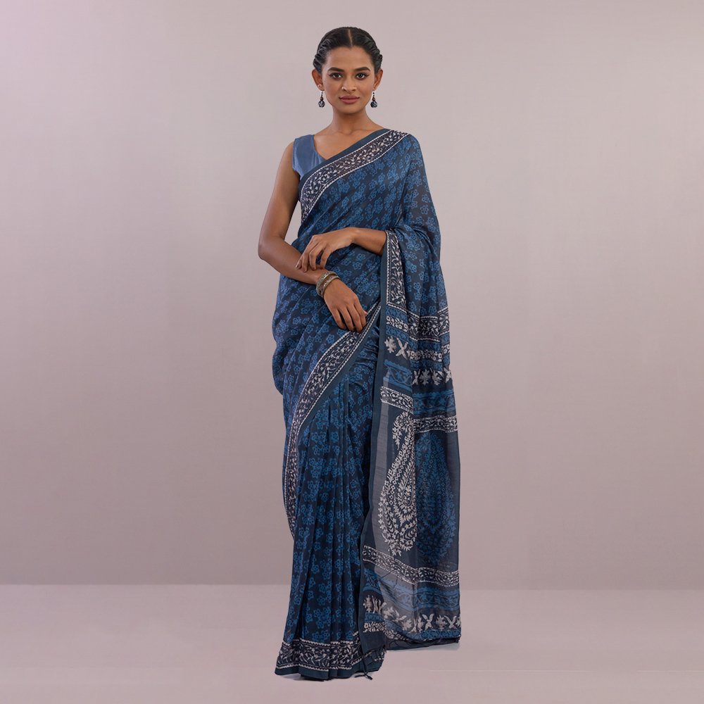 With the impulsive color of blue, this half silk saree comes from the essence of nature. Wax-resistant dye was used to enhance the appearance with exclusive designs.