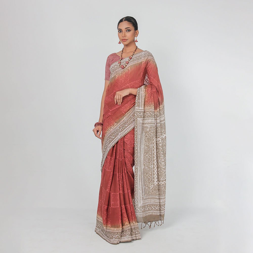 This wax printed cotton saree is dyed using the natural ingredients to bring out the marvelous soothing color of the product. All Aranya products are handmade, using natural materials, within a fair trade framework.