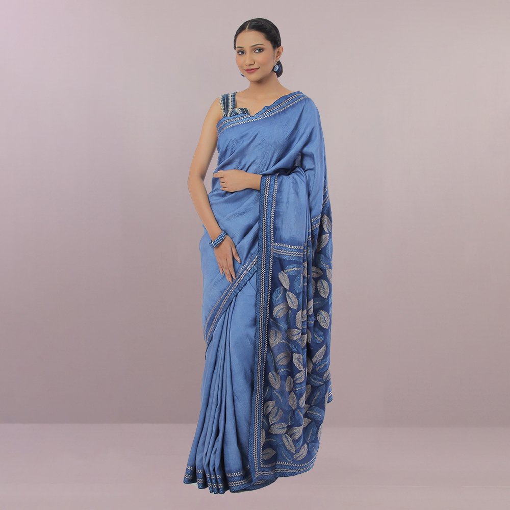 This perfect saree has been made with competence kantha work on the traditional silk fabric. The saree provides the best of comfort and gracefulness with Kantha stitch with indigo and golden at paar anchol.