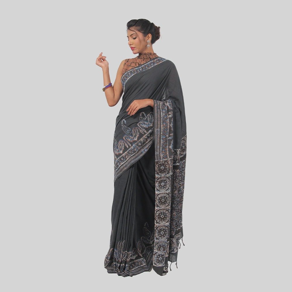 This Wax printed Eri Cotton saree was dyed using the natural ingredients to bring out the marvelous colors of the product. All Aranya products are handmade, using natural materials, within a fair trade framework