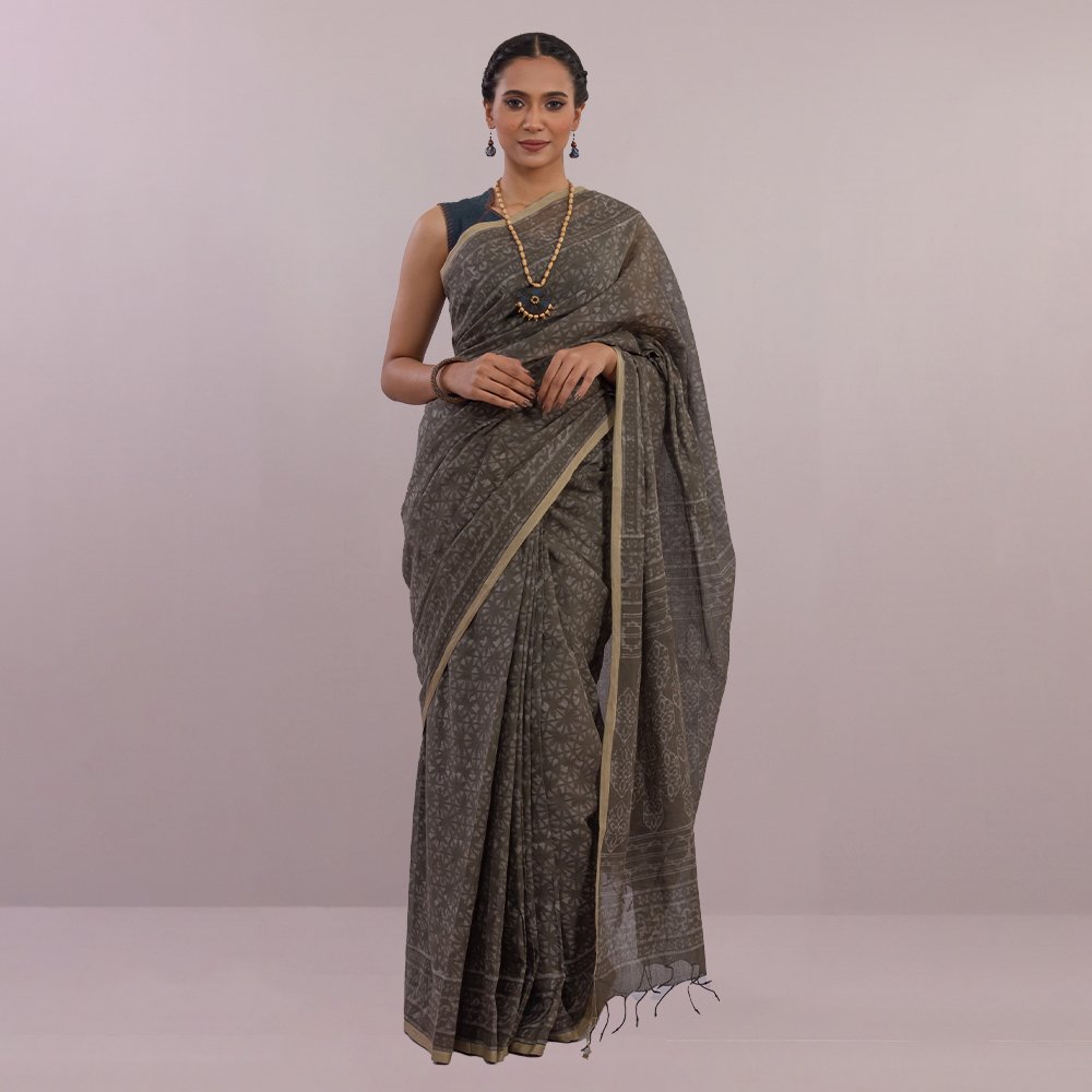 Olive and Gray have been used as dyeing materials on this cotton kota saree. Wax print was used to get the elegant design. All Aranya products are handmade, using natural fibers and materials, within a fair trade framework.