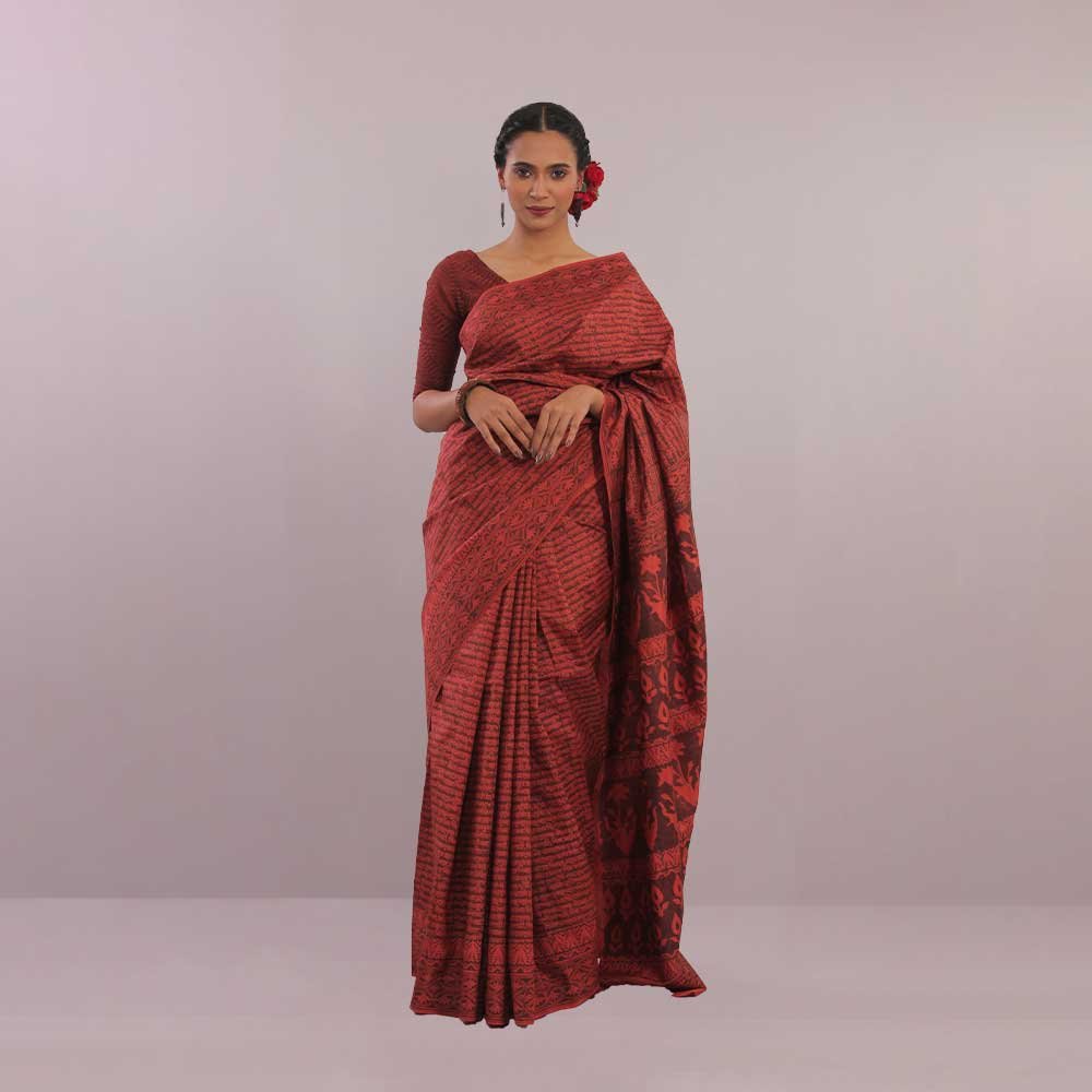 With an inspiration of a deep red shade, this silk saree is printed in the natural block print for a delight look. All Aranya products are handmade, using natural fibers and materials within a fair-trade framework