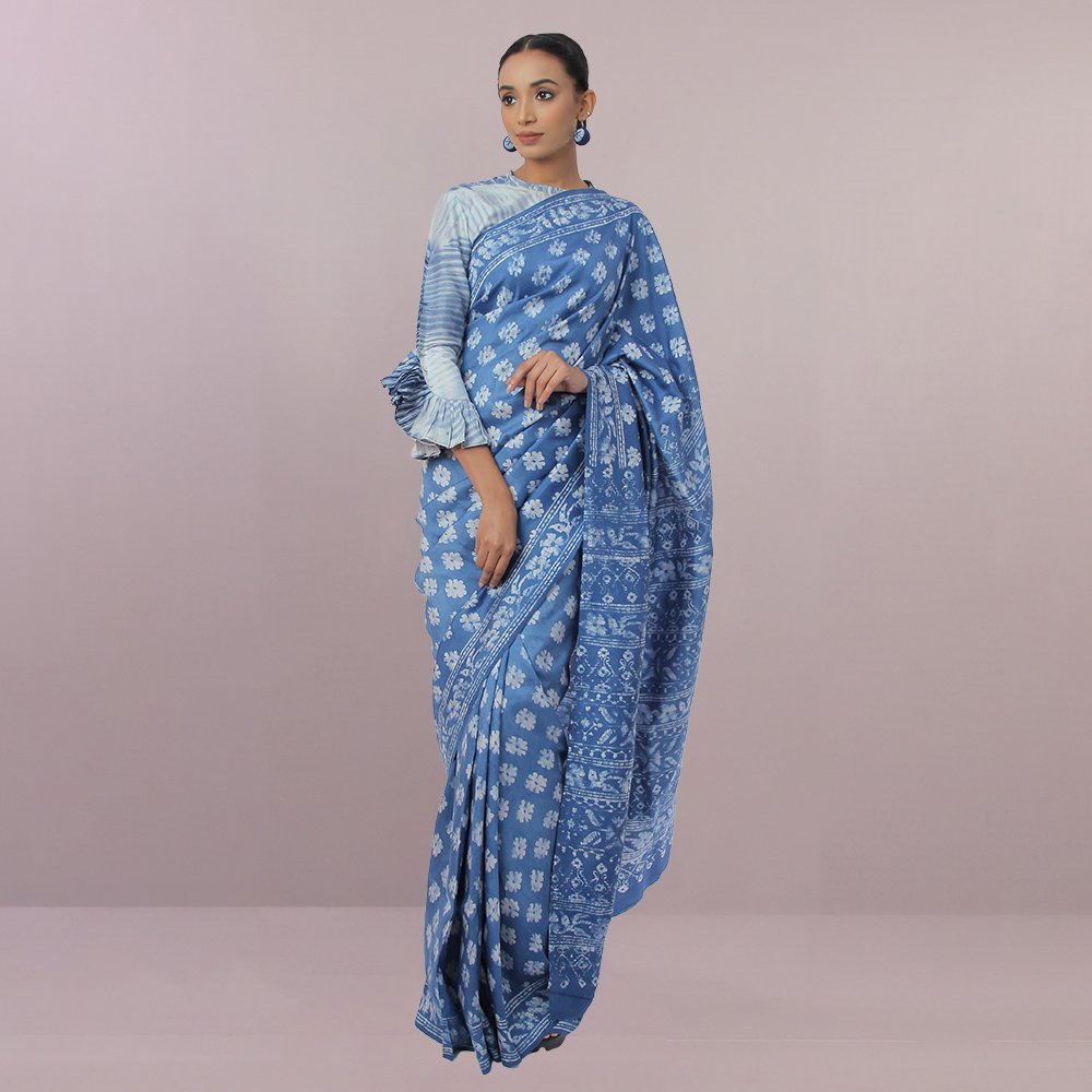 This Wax printed Silk saree was dyed using the natural ingredients to bring out the marvelous indigo color of the product.