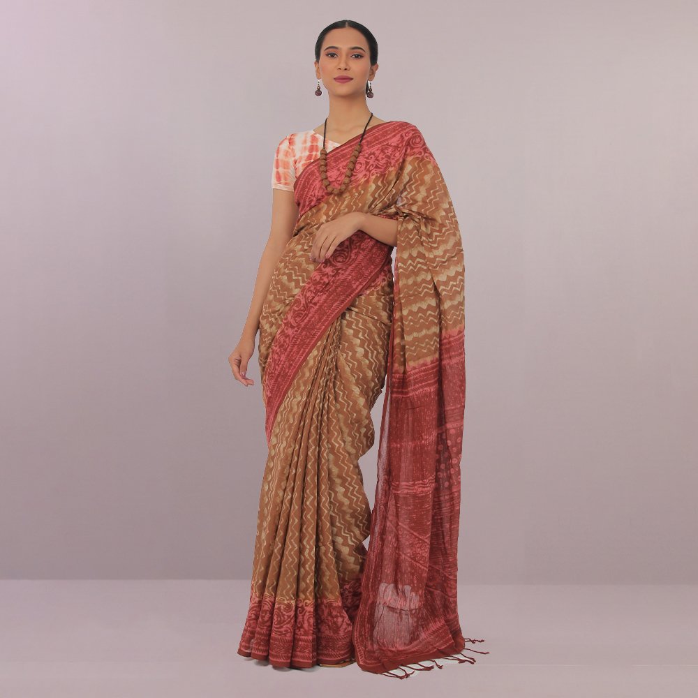 This blended cotton saree is present the fusion of madder & grey which gives it a magnificent look.All Aaranya products are handmade, using natural materials, within a fair trade framework.”