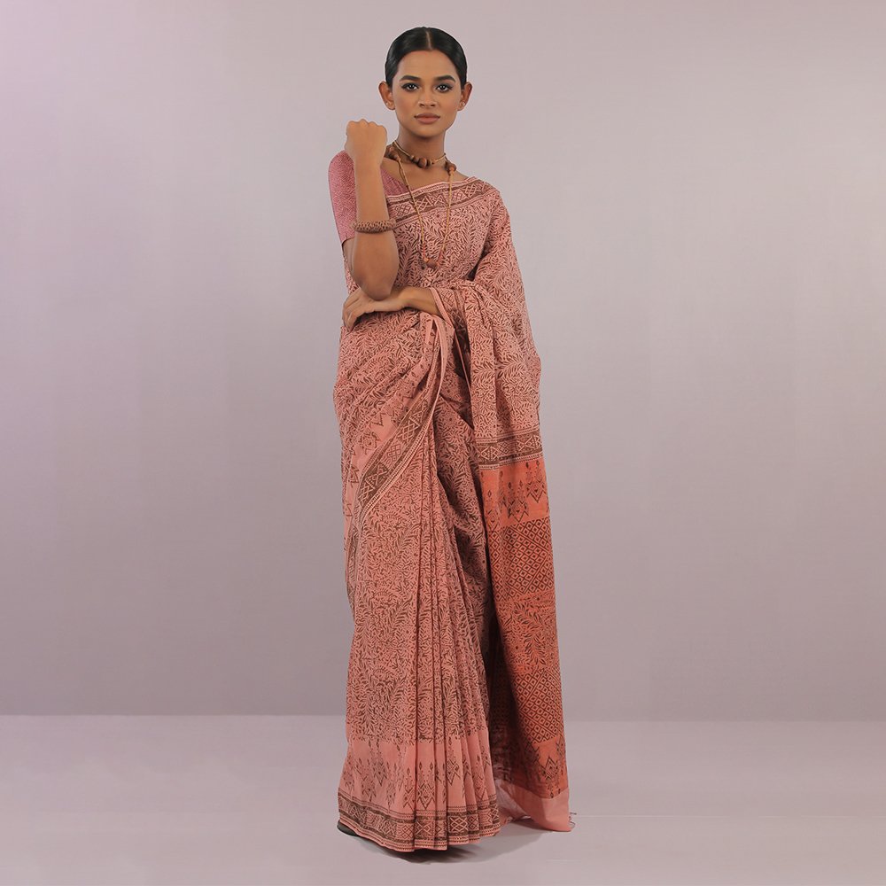 The very breathable fabric of this saree stands out like no other. With stunning imprints of natural red print, this cotton saree will be your to go choice for any occasion.