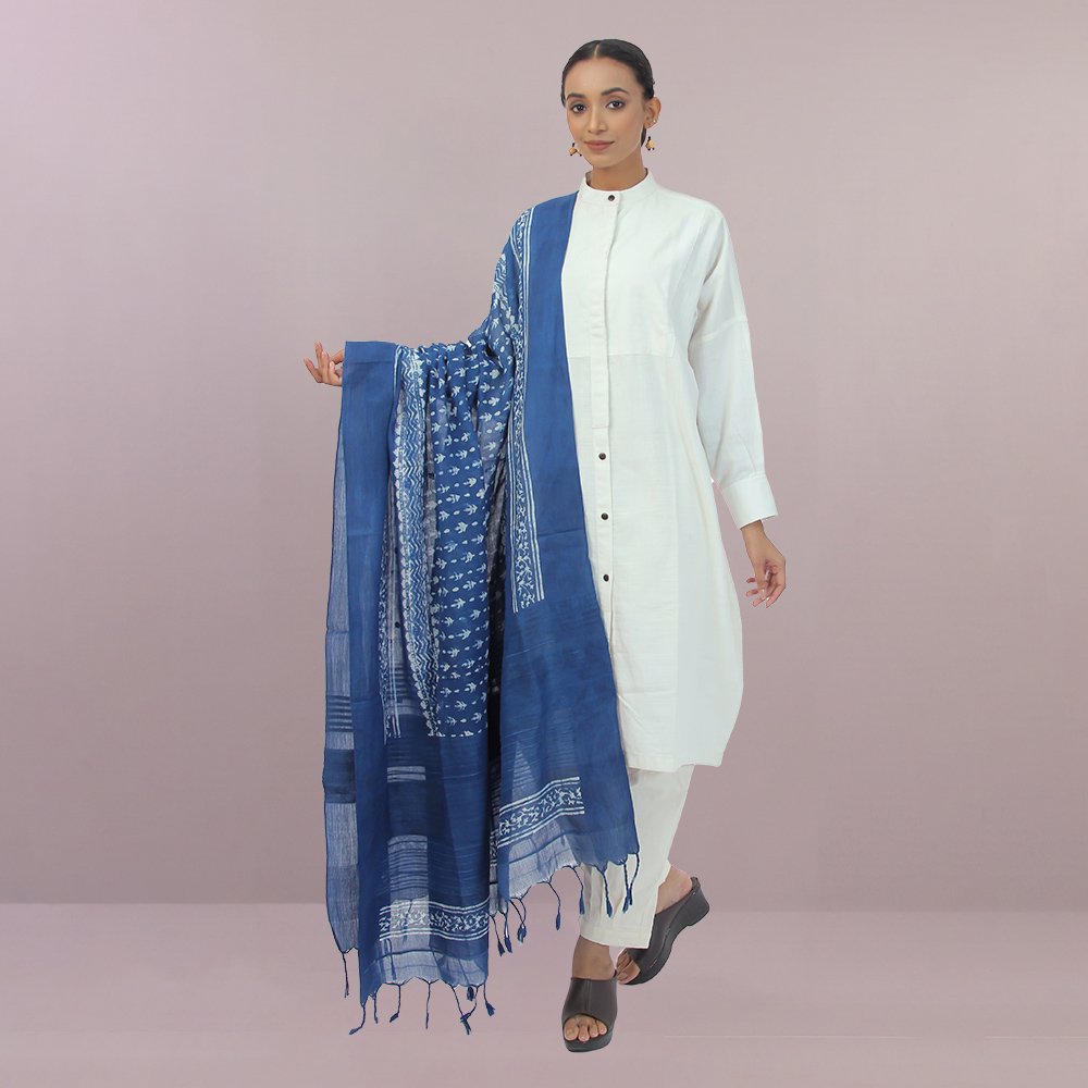 Natural ingredient, Indigo was used to dye this cotton orna in blue color. The wax print technique was used to amplify its bold design. All Aranya products are handmade, using natural fibers and materials within a fair-trade framework.