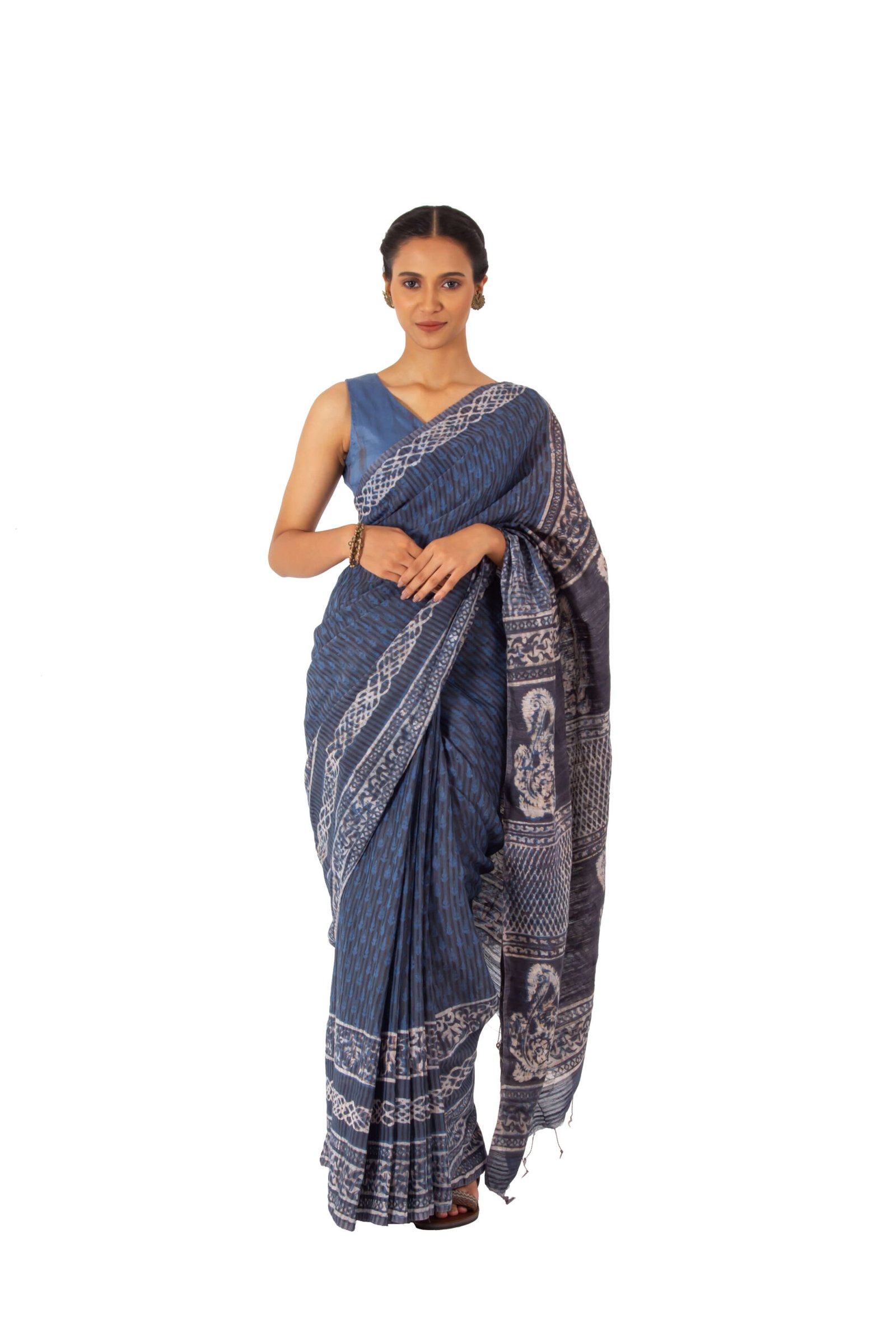 Blue and Gray have been used as dyeing materials on this eri half silk saree. Wax print and Kantha stitch was used to get the elegant design. All Aranya products are handmade, using natural fibers and materials, within a fair trade framework.